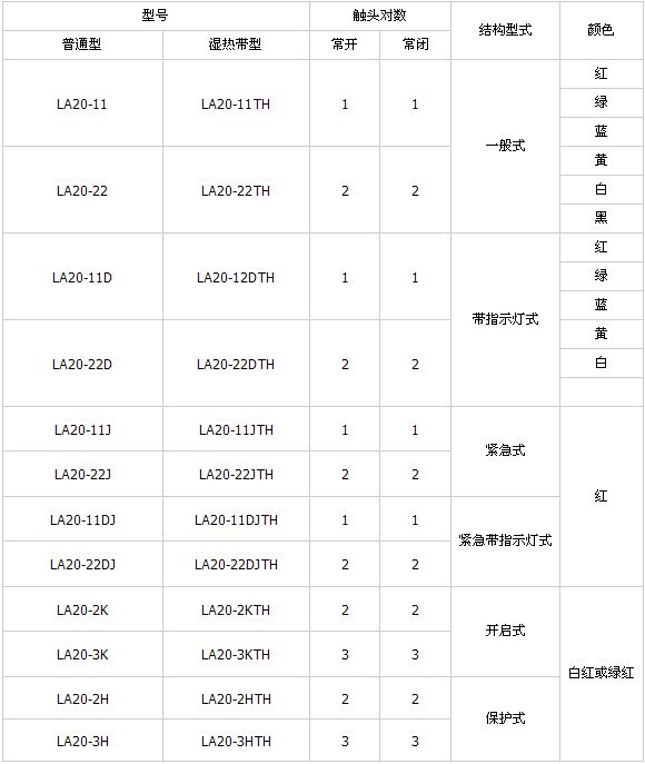 LA20 由觸頭組和操作機(jī)構(gòu)組成。除常見的單鈕開關(guān)外,還有兩個或三個按鈕開關(guān)組成的開啟式或保護(hù)式按鈕開關(guān)。