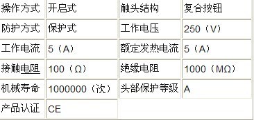 組合式 觸頭結構:復合按鈕 防護方式:保護式 工作電壓:220(V) 工作電流:5(A) 額定發熱電流:5(A) 頭部保護等級:IP55