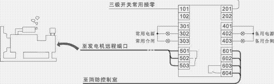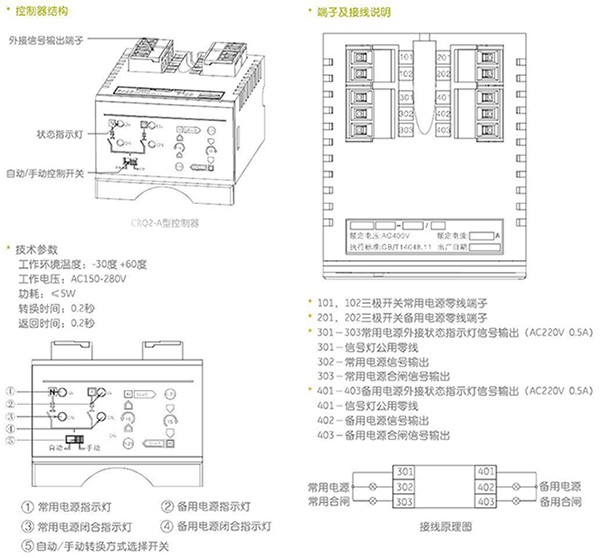 ??當備用是自啟動發電機組時,用戶可通過501-503端子與發電控制器連接后完成自動啟動發電機功能,501-503內部為一組3A無源繼電器干節點,503為繼電器公共端,50l為繼電器常閉點,502為常開點;當常用電源正常時503與5014閉合,503與502斷開,若常用電源出現故障且備用503與502閉合,同時503與501斷開發出發電機啟動信號,發電機啟動成功后開關自動轉換到備用電源側向負載供電在備用電源供電過程中如果常用電源恢復智能正常,則控制器經返回延時后控制開關轉換到常用電源,常用斷路器閉合后503與501延時3秒后閉合,503與502斷開發出停機信號。